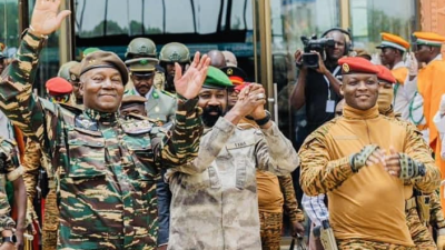 From left to right: Niger's President General Abdourahamane Tiani, Burkina Faso's President Ibrahim Traoré, and Mali's President Colonel Assimi Goïta, following their meeting in Niger to announce the Sahel Confederation.