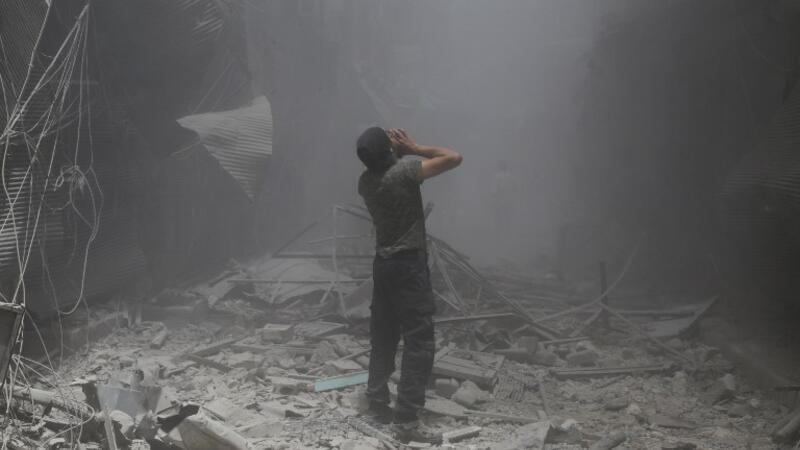 A Syrian man reacts following a reported air strike by Syrian government forces in the rebel-held neighborhood of Bustan al-Qasr on June 5, 2016. (AFP/Baraa al-Halabi)