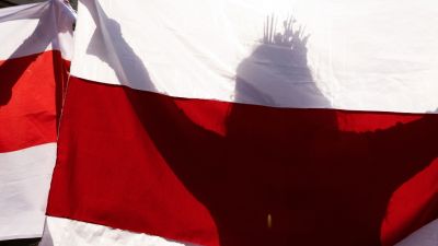 A woman carries a former white-red-white flag of Belarus as she parades through the streets during an opposition rally to protest against the presidential inauguration in Minsk on September 26, 2020. Belarus leader Alexander Lukashenko held his presidential inauguration in secret on September 23, 2020, after claiming victory in disputed polls that his opposition rivals have described as massively rigged. STRINGER / AFP