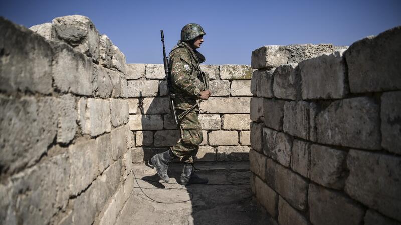 An Armenian soldier walks at the front line as troops hold positions on October 18, 2020, during the ongoing fighting between Armenia and Azerbaijan over the disputed region. / AFP / ARIS MESSINIS