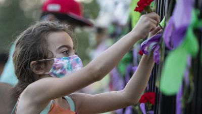 The procession started at the site where three generations of a family out for a Sunday evening stroll -- 46-year-old Salman Afzaal, his 44-year-old wife Madiha Salman, their 15-year-old daughter Yumna Salman and her 74-year-old grandmother, Talat Afzaal -- were killed in London, southern Ontario, as they were waiting to cross the street. Nicole OSBORNE / AFP