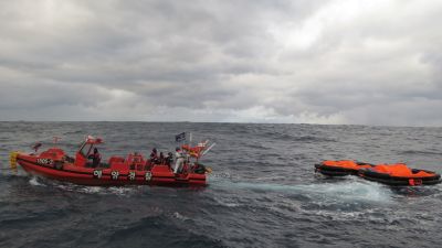 This handout photo from the Korea Coast Guard taken and released on January 25, 2023 shows coast guard forces searching for missing people after a Hong Kong cargo ship sank off South Korea's southern island of Jeju. (Photo by Handout / KOREA COAST GUARD / AFP)