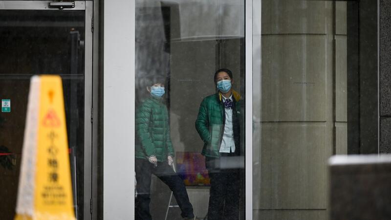 Two women wearing face mask look through a window in building in Beijing on February 14, 2020. The death toll from the COVID-19 coronavirus epidemic neared 1,400 on February 14, as the United States complained of a "lack of transparency" from Beijing over its handling of a crisis that has fuelled global panic. STR / AFP