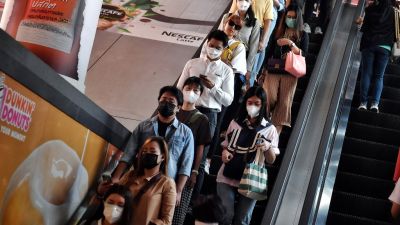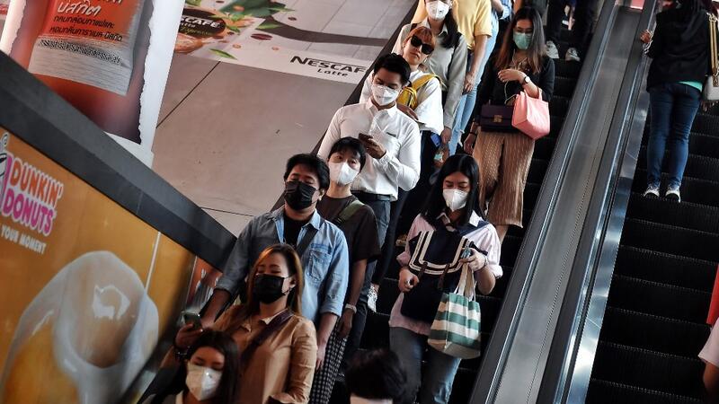 This photo taken on February 18, 2020 shows people wearing protective facemasks, amid concerns of the COVID-19 coronavirus outbreak, as they ride on an escalator during the morning commute in Bangkok. Lillian SUWANRUMPHA / AFP