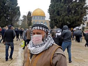 A Palestinian man wearing a protective mask as a measure of protection against the coronavirus COVID-19, stands in front of the Dome of the Rock mosque on the Temple Mount in the Old City of Jerusalem, ahead of the Friday prayers, on March 6, 2020. (Ahmad Gharabli/AFP)