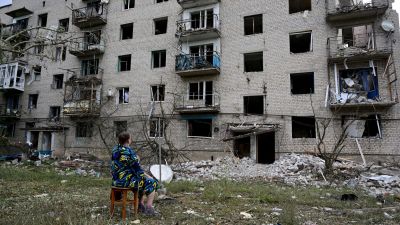 A woman sits in front of her building, which has been partialy destroyed after a Russian missile hit on a four-storey residential building in Chasiv Yar, Bakhmut District, eastern Ukraine, on July 10, 2022. (Photo by MIGUEL MEDINA / AFP)