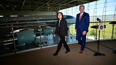 US Speaker of the House Kevin McCarthy (R) and Taiwanese President Tsai Ing-wen leave after speaking to the press after a bipartisan meeting at the Ronald Reagan Presidential Library in Simi Valley, California, on April 5, 2023. McCarthy met with Tsai in California on Wednesday, a meeting that has infuriated China. (Photo by Frederic J. Brown / AFP)