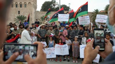 In this file photo taken on October 2, 2020, Libyan demonstrators lift placards and national flags during a rally in Martyrs Square in the capital Tripoli, to protest the deteriorating political, security, and living conditions in the country. (Photo by Mahmud TURKIA / AFP)