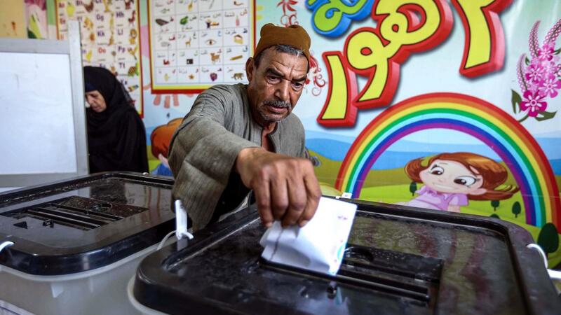 A man casts his ballot at a polling station in El-Ayyat, south of the Egyptian capital on October 24, 2020, during the first stage of the lower house elections. Polling stations opened in Egypt for parliamentary elections in which there was little doubt of a sweeping victory for supporters of hardline President Abdel Fattah al-Sisi. Some 63 million voters out of Egypt's more than 100 million people are eligible to elect 568 of the 596 lawmakers in the lower house, widely seen as a rubber-stamp body for exec