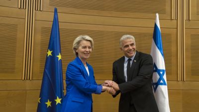 Von der Leyen met with Israeli Foreign Minister Yair Lapid at the Knesset, Israel's Parliament, in Jerusalem following her arrival on Monday.