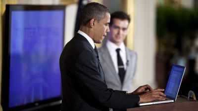 President Barack Obama posts a Tweet during an online Twitter town hall meeting from the East Room of the White House July 6, 2011 in Washington, DC. (BRENDAN SMIALOWSKI / GETTY IMAGES NORTH AMERICA / Getty Images via AFP)
