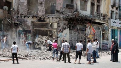Yemeni people inspect the damage to a building in Aden. Image used for illustrative purposes. (Al Bawaba/File)
