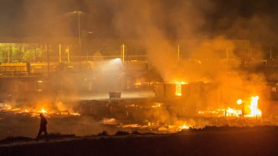 The blaze started during a fight between Kurds and Afghans at the Grande-Synthe camp, near the port of Dunkirk.