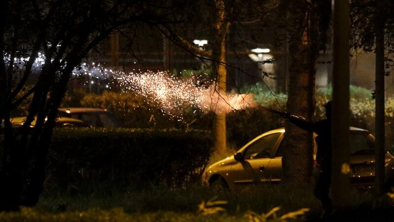 People fire fireworks during clashes in Villeneuve-la-Garenne, in the northern suburbs of Paris, on April 20, 2020. Tension with the police erupted again on the evening of April 20 in Villeneuve-la-Garenne near Paris, where a motorcycle accident involving the police had provoked the first clashes with residents two days before. GEOFFROY VAN DER HASSELT / AFP