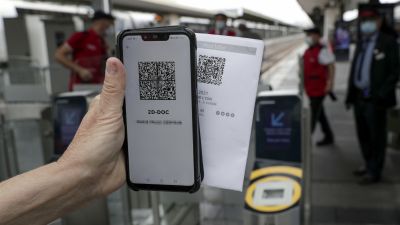 Day one of the measure saw major restaurants and cafes displaying notices saying "Please show your health pass," and trains and airlines issuing bracelets to passengers to show compliance with the passes.