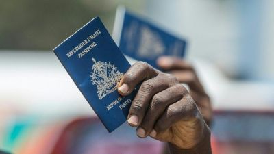 Haitian citizens hold up passports as they gather in front of the US Embassy in Tabarre, Haiti on July 10, 2021, asking for asylum after the assassination of President Jovenel Moise explaining that there is too much insecurity in the country and that they fear for their lives. Valerie Baeriswyl / AFP