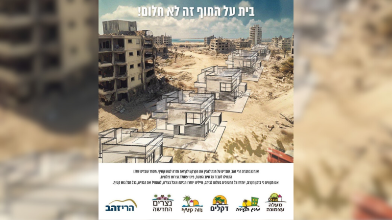 Harei Zahav posted a picture of a poster showing the blueprints for beach houses, built on the rubble of destroyed Gazan houses and towers.