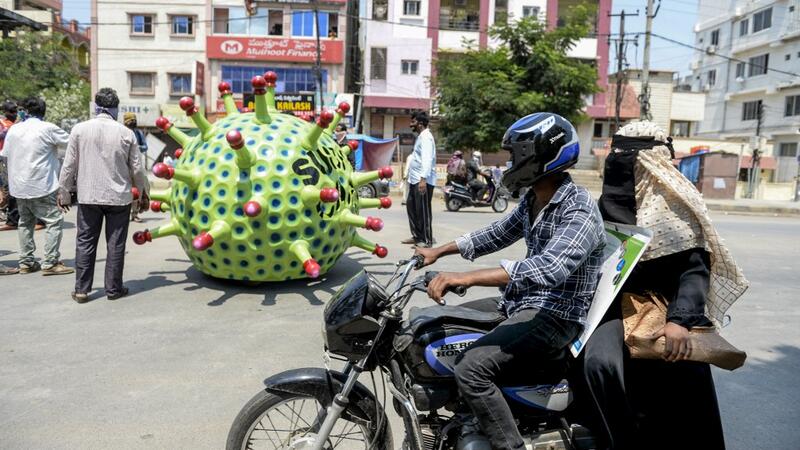 People drive past as inventor Sudhakar Yadav (inside) leads his coronavirus-themed made car on a road for an awareness campaign during a government-imposed nationwide lockdown as a preventive measure against the COVID-19 coronavirus, in Hyderabad on April 8, 2020. NOAH SEELAM / AFP