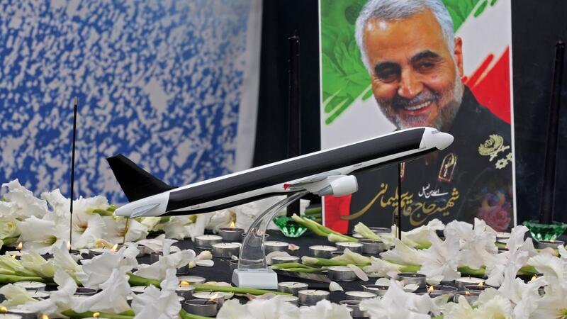 A poster of slain military commander Qasem Soleimani is seen at a memorial for the victims of the Ukrainian plane crash, in University of Tehran on January 14, 2020. Iran announced its first arrests over the shooting down of a Ukrainian airliner last week, as it struggles to contain the fallout from the disaster that sparked three days of protests. ATTA KENARE / AFP