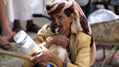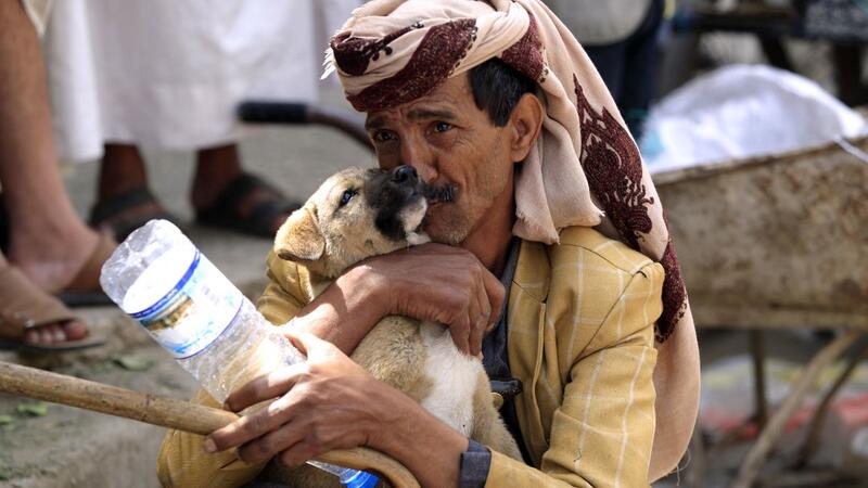 A Yemeni man plays with a puppy in a street in the capital Sanaa, on July, 13, 2020. MOHAMMED HUWAIS / AFP