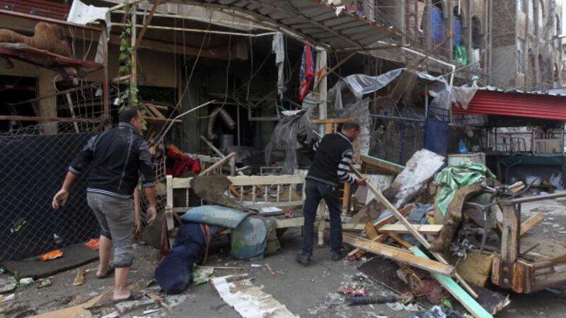 Iraqi men clean the rubble at the site of a blast that took place the previous day outside a cafe in Baghdad's Bayaa neighborhood on November 21, 2013. [Getty Images]