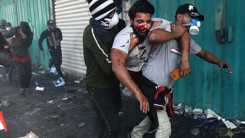 In this file photo taken on November 15, 2019, Iraqis carry a protester wounded after being struck by a tear gas canister amidst clashes with security forces at the capital Baghdad's Khallani square during ongoing anti-government demonstrations. At least 3,000 people who have been maimed in Baghdad and southern Iraq since anti-government protests erupted on October 1, according to the NGO Iraqi Alliance for Disabilities Organisation (IADO). After decades of back-to-back conflicts, Iraq is in the thick of it