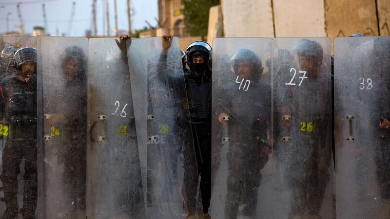 Iraqi riot police form a barier as demonstrators gather near the local administration building in the southern city of Basra on November 6, 2020, during an anti-government protest. Hussein FALEH / AFP