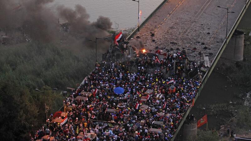 Iraqi protesters gather on al-Jumhuriya bridge which leads to the high-security Green Zone, during ongoing anti-government demonstrations in the capital Baghdad on October 31, 2019. Iraq's president vowed today to hold early elections in response to a month of deadly protests, but demonstrators said the move fell far short of their demands for a political overhaul. AHMAD AL-RUBAYE / AFP