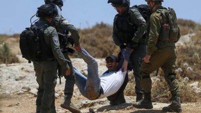 Israeli soldiers remove a Palestinian Masafer Yatta (AFP File Folder)