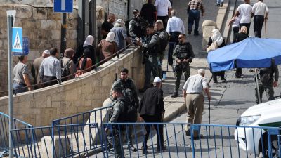 Muslim worshippers arrive at the Lion's Gate as they make their way to the the Al-Aqsa Mosque (AHMAD GHARABLI/AFP)