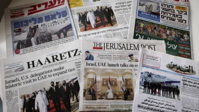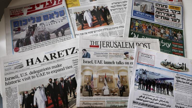 This picture taken on September 1, 2020 in Jerusalem shows the front pages of Israeli and Palestinian newspapers with images of the US-Israeli delegation arriving to Abu Dhabi on the first commercial flight from Tel Aviv to mark the normalisation of ties between the Jewish state and the UAE. MENAHEM KAHANA / AFP