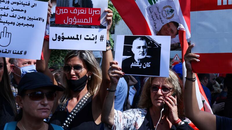 Other banner slogans read: “Last chance for justice in the country,” “Lebanon is a hostage and besieged,” and “We will not forget.”