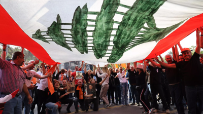 Supporters of Lebanon's outgoing President Michel Aoun hold up his picture and unfurl a large national flag in front of the presidential palace anwar amro AFP