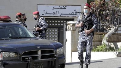 Policemen stand guard outside a detention centre from which prisoners had fled earlier in Baabda, east of Lebanon's capital Beirut, on November 21, 2020. At least 69 people fled a detention centre in Lebanon on November 21, including five who later died in a car accident on a nearby road, sparking a wide-reaching manhunt, police said. ANWAR AMRO / AFP