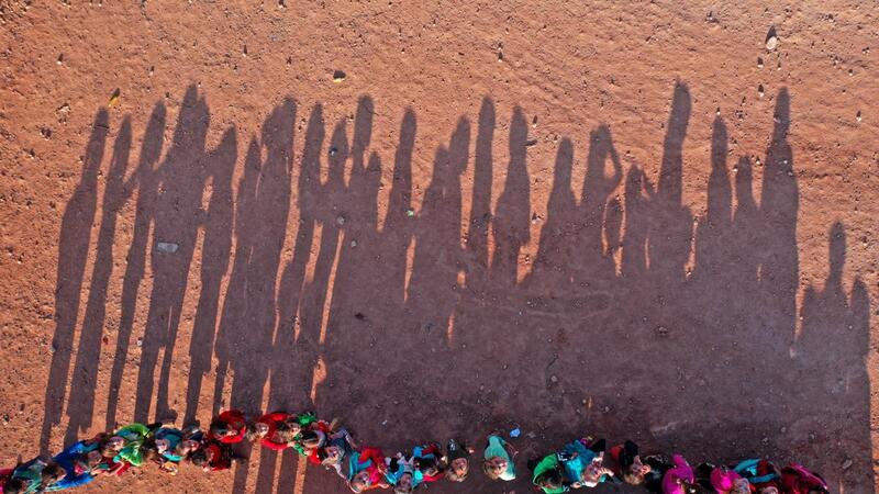 An aerial view taken on October 6, 2020, shows displaced Syrian youths standing in a queue ahead of classes, after tents were transformed to classrooms, at a camp for the internally displaced in the town Maarrat Misrin in Syria’s northwestern Idlib province. Omar HAJ KADOUR / AFP