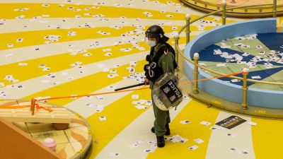 A woman holding a sign displaying the Union Flag was also held while others were detained for 'possessing items advocating independence'. Around 370 were arrested on other charges, including unlawful assembly and possessing weapons.