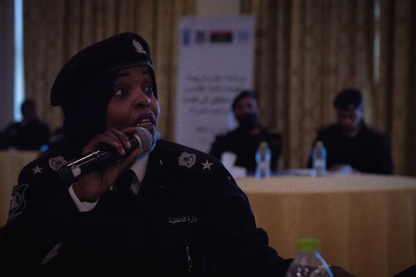 February 2021, Tripoli (Libya). Lieutenant colonel Ms. Nour Al-Said Muhamed shares solutions to reducing violence against women in Libya at the Gender-Based Violence workshop. Photo: ©UNDP/ Malek Almoghrabi.