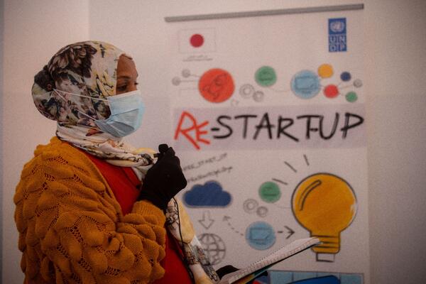 December 2020, Tawargha (Libya). One of the entrepreneurs from Tawergha presents her business idea during the Re-Start-Up Marathon. Photo: ©UNDP Libya/Malek Elmaghrebi