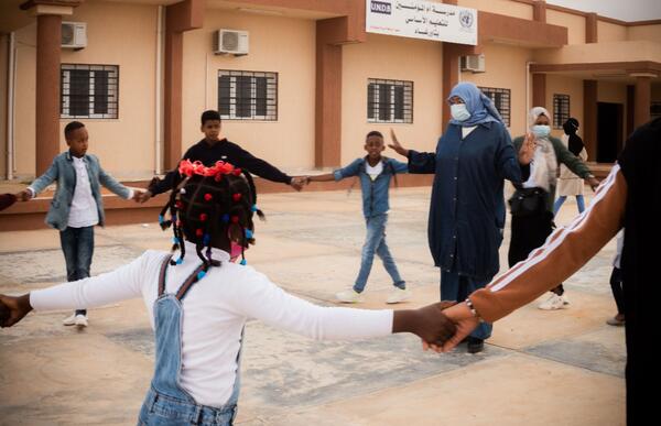 January 2021, Tawargha (Libya). Ms. Salima Khamis (in the middle) with children during entertainment activities at Um Al Moamineen School in Tawergha. Photo: ©UNDP Libya/Malek Elmaghrebi