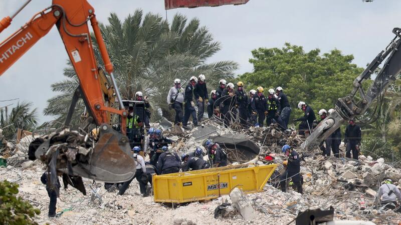 The site was toured Monday by Florida Gov. Ron DeSantis, who said the demolition has allowed rescuers to search through rubble containing what were once bedrooms.