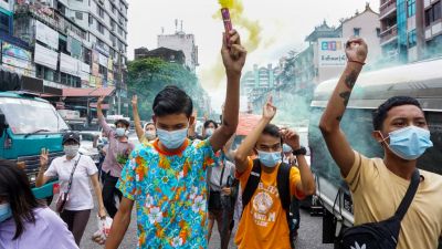 A protester holds a flare as others make the three-finger salute during a demonstration against the military coup in Yangon on June 22, 2021. STR / AFP