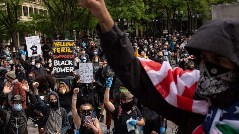 Demonstrators gather to protest the recent death of George Floyd on May 31, 2020 in Seattle, Washington. Protests due to the recent death of George Floyd took place in Seattle and its suburb of Bellevue, with looting in Bellevue and at least one burned automobile there. David Ryder/Getty Images/AFP David Ryder / GETTY IMAGES NORTH AMERICA / Getty Images via AFP