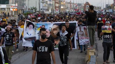 Iraqi protesters march during an anti-government demonstration in the southern city of Basra on November 13, 2020. Hussein FALEH / AFP