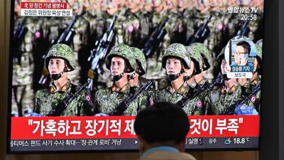 A man watches a television news broadcast of a military parade commemorating the 75th anniversary of North Korea's ruling Workers' Party held in Pyongyang, at a railway station in Seoul on October 10, 2020. Nuclear-armed North Korea held a giant military parade on October 10, television images showed, with thousands of maskless troops defying the coronavirus threat and Pyongyang expected to put on show its latest and most advanced weapons. Jung Yeon-je / AFP
