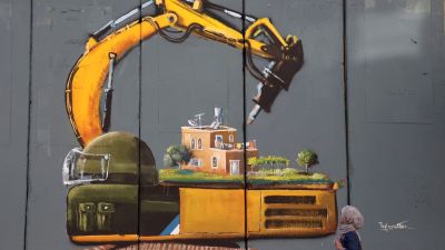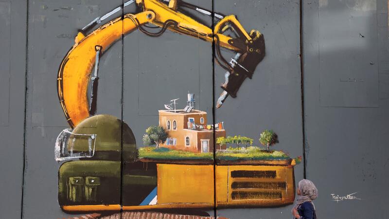 A woman walks past a graffiti mural depicting an Israeli soldier with a bulldozer about to demolish a Palestinian house, drawn by Palestinian artist Taqi Spateen, along Israel's controversial separation barrier in the city of Bethlehem, in the occupied West Bank, on June 14, 2021. / AFP / HAZEM BADER