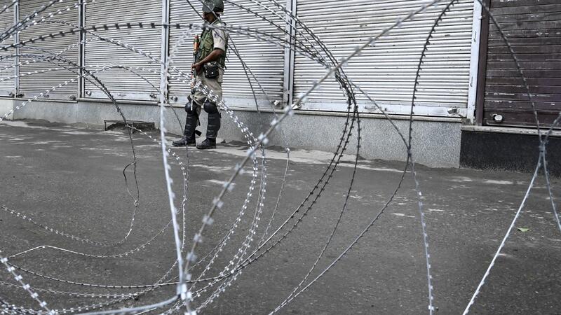 A security personnel stands guard behind a barbed fence wire during a lockdown in Srinagar (AFP)