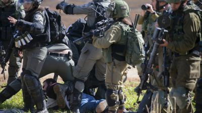 Israeli soldiers arrest a Palestinian protester during a demonstration against a US brokered Middle East peace plan near the West Bank village of Tamun near the Jordan Valley on January 31, 2020. AFP