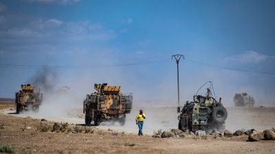 Turkish and Russian military vehicles patrol in the countryside of Rumaylan (Rmeilan) in Syria's northeastern Hasakeh province near the Turkish border, on September 16, 2021. (Photo by Delil SOULEIMAN / AFP)