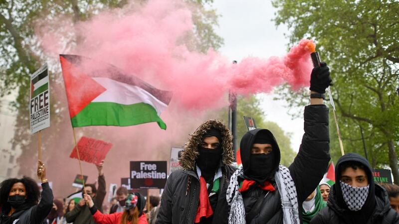 Demonstrators could be seen wearing costumes, masks and face paint, while others were draped in the Palestinian flag.