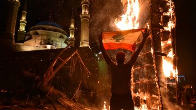 A Lebanese man raises a national flag as the ‘Revolution fist’, symbol of Lebanon’s October 2019 uprising, burns after being torched during clashes between anti-government protesters and supporters of former prime minister Saad Hariri, in the capital Beirut's central Martyr's square, on October 21, 2020. Hariri resigned as premier in October 2019 in the wake of unprecedented street protests, but he is now expected to make a comeback at the helm of the next government. Most parliamentary blocs have pledged support for Hariri, although the President Aoun and his Free Patriotic Movement are against his nomination. AFP